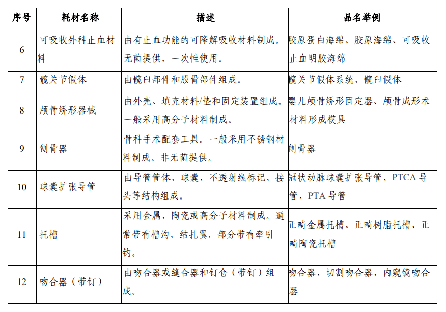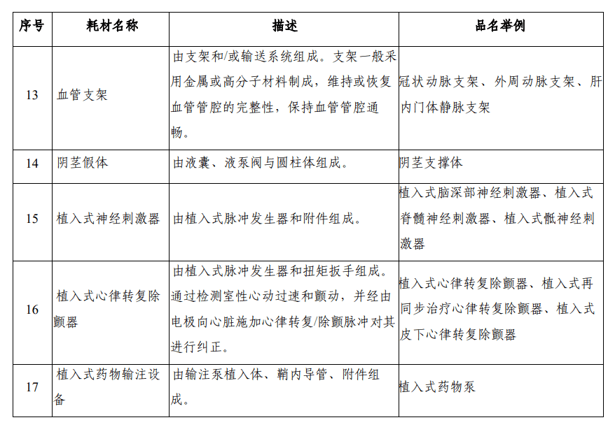 其中包括單/多部件金屬骨固定器械及附件、導(dǎo)絲、耳內(nèi)假體、頜面部贗復(fù)及修復(fù)重建材料及制品、脊柱椎體間固定/置換系統(tǒng)、可吸收外科止血材料、髖關(guān)節(jié)假體、顱骨矯形器械、刨骨器、球囊擴張導(dǎo)管、托槽、吻合器(帶釘)、血管支架、陰莖假體、植入式神經(jīng)刺激器、植入式心律轉(zhuǎn)復(fù)除顫器、植入式藥物輸注設(shè)備、椎體成形導(dǎo)引系統(tǒng)這18類耗材。