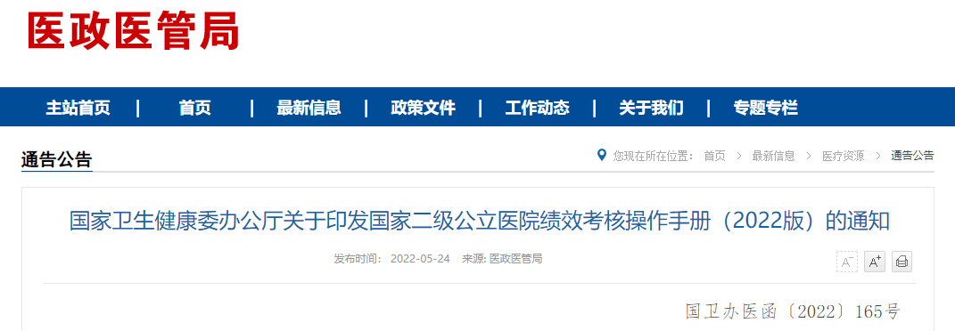 5月24日,國家衛(wèi)健委發(fā)布了《國家衛(wèi)生健康委辦公廳關(guān)于印發(fā)國家二級公立醫(yī)院績效考核操作手冊(2022版)的通知》(以下簡稱通知)。