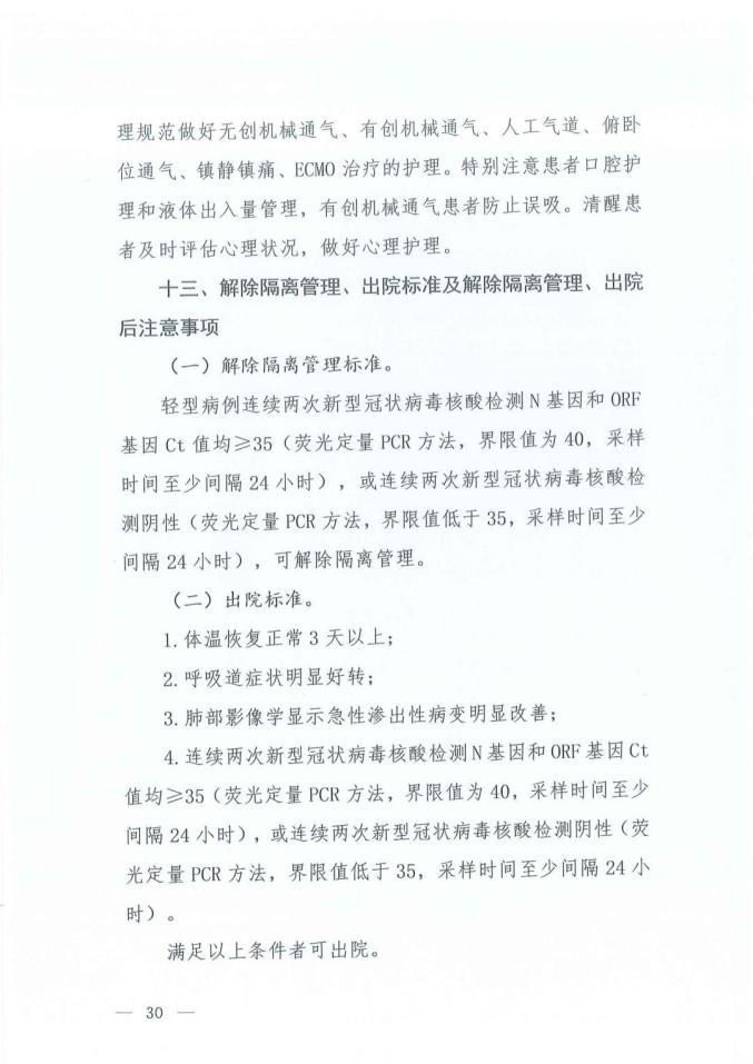 10、出院標準有較大更新:連續(xù)兩次新型冠狀病毒核酸檢測N基因和ORF基因Ct值均≥35(熒光定量PCR方法,界限值為40,采樣時間至少間隔24小時),或連續(xù)兩次新型冠狀病毒核酸檢測陰性(熒光定量PCR方法,界限值低于35,采樣時間至少間隔24小時)。