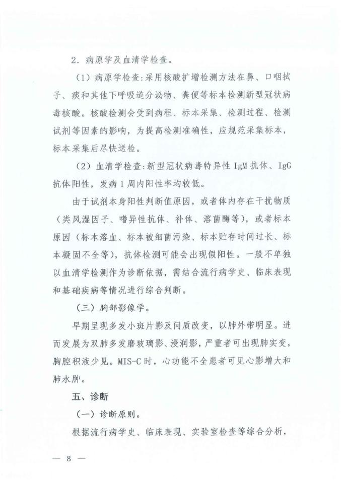 4、“診斷原則”提到:新型冠狀病毒核酸檢測陽性為確診的首要標準。未接種新型冠狀病毒疫苗者,新型冠狀病毒特異性抗體檢測可作為診斷的參考依據(jù)。接種新型冠狀病毒疫苗者和既往感染新型冠狀病毒者,原則上抗體不作為診斷依據(jù)。