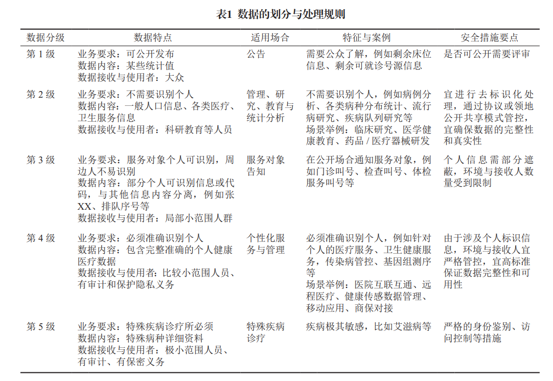 對于醫(yī)療健康數(shù)據(jù)的應(yīng)用是多方面的,保護(hù)這些信息安全的方法也需要有多種方式。其中對于醫(yī)療健康數(shù)據(jù)的分類分級管理是一種常用且可行的方法。這種方法就是根據(jù)醫(yī)療健康數(shù)據(jù)中涉及患者個(gè)人信息的多少進(jìn)行分類管理?;驹瓌t是包含患者個(gè)人信息越多的數(shù)據(jù),就需要在越嚴(yán)格受控的環(huán)境下使用;當(dāng)數(shù)據(jù)無法識別出患者個(gè)人信息時(shí),就可以在比較寬松的環(huán)境中應(yīng)用。在《網(wǎng)絡(luò)安全法》和《數(shù)據(jù)安全法》等法規(guī)中,也明確對那些不能識別個(gè)人信息且不可恢復(fù)識別的數(shù)據(jù)可以按照不同的方式管理。國家標(biāo)準(zhǔn)《信息安全技術(shù) 健康醫(yī)療數(shù)據(jù)安全指南》[19]中給出了對患者個(gè)人信息的劃分、去除規(guī)則、醫(yī)療數(shù)據(jù)分級以及分級應(yīng)用范圍等的具體處理方法建議。表1是對數(shù)據(jù)的劃分與處理規(guī)則。醫(yī)院在建設(shè)信息系統(tǒng)、建立科研和管理數(shù)據(jù)倉庫、處理研究與管理應(yīng)用數(shù)據(jù)時(shí),可以參考標(biāo)準(zhǔn)所給出的這些分類分級方法。同時(shí)在這個(gè)標(biāo)準(zhǔn)中還提供了個(gè)人信息的去除、轉(zhuǎn)換等相應(yīng)的處理方法,可以作為醫(yī)院進(jìn)行信息安全建設(shè)的參考。