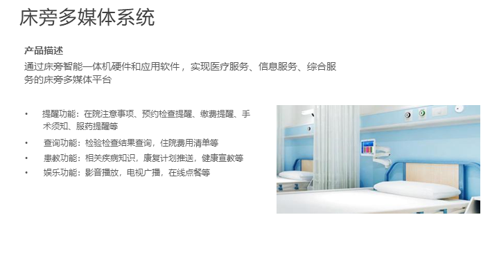 配合床旁使用的智能硬件,可解決住院患者信息獨創(chuàng)的院內(nèi)藍牙物聯(lián)網(wǎng)模式,化管理的“最后一米”瓶頸。同時結(jié)合的智能醫(yī)療和智能護理軟、硬件,可實現(xiàn)護理管理、患者教育、床旁教學等全程智能化管理。