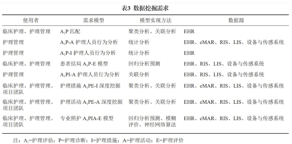 根據(jù)專業(yè)照護(hù)挖掘需求分析及決策目的對(duì)數(shù)據(jù)集中提取的數(shù)據(jù)通過集成數(shù)據(jù)挖掘模塊進(jìn)行數(shù)據(jù)挖掘,挖掘方法包括回歸分析、關(guān)聯(lián)分析、聚類分析、模糊推理、神經(jīng)網(wǎng)絡(luò)算法等,見表3。