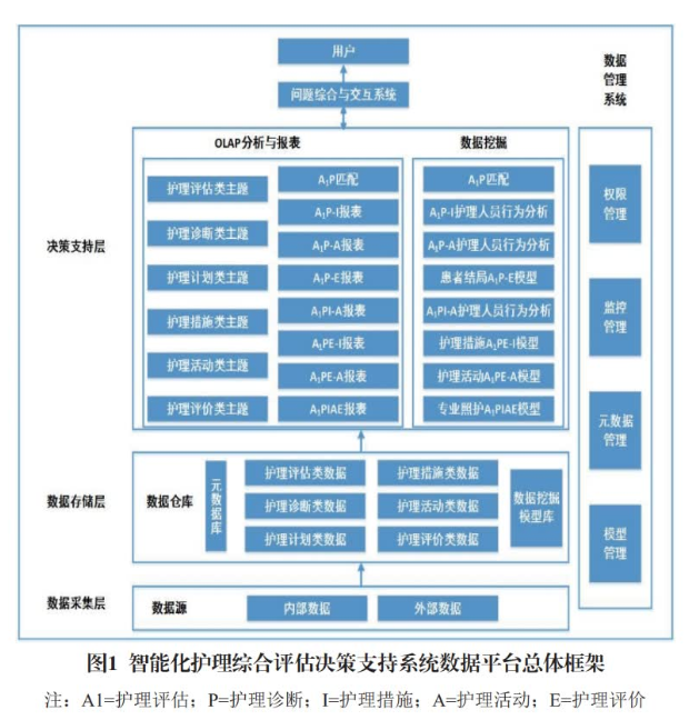 數(shù)據(jù)管理是智能化護(hù)理綜合評(píng)價(jià)分析和決策的基礎(chǔ)和核心,涉及的內(nèi)容包括用戶權(quán)限管理、元數(shù)據(jù)管理、模型管理及監(jiān)控管理。①權(quán)限管理:通過訪問協(xié)議進(jìn)行臨床護(hù)理、護(hù)理管理、項(xiàng)目維護(hù)人員身份驗(yàn)證和授權(quán),實(shí)現(xiàn)數(shù)據(jù)平臺(tái)電子簽章、用戶名及密碼管理。②元數(shù)據(jù)管理:元數(shù)據(jù)是數(shù)據(jù)倉(cāng)庫(kù)中“關(guān)于數(shù)據(jù)的數(shù)據(jù)”。元數(shù)據(jù)管理是智能化護(hù)理綜合決策數(shù)據(jù)平臺(tái)的重要環(huán)節(jié),負(fù)責(zé)對(duì)數(shù)據(jù)結(jié)構(gòu)、源數(shù)據(jù)、數(shù)據(jù)倉(cāng)庫(kù)數(shù)據(jù)轉(zhuǎn)換規(guī)則、約束條件、ETL映射關(guān)系、數(shù)據(jù)模型、任務(wù)參數(shù)、數(shù)據(jù)存儲(chǔ)及更新策略等元數(shù)據(jù)信息進(jìn)行標(biāo)準(zhǔn)定義、配置、存取和管理維護(hù)。③模型管理:模型管理獨(dú)立調(diào)用決策問題庫(kù)、模型庫(kù)和數(shù)據(jù)模型算法庫(kù),是智能化護(hù)理綜合決策數(shù)據(jù)平臺(tái)的重要組成部分。其中,決策問題庫(kù)采用數(shù)據(jù)庫(kù)形式存放歷史決策問題、子問題及其求解路徑:模型庫(kù)存放決策問題、決策任務(wù)所使用的模型,包括模型的名稱、描述、算法、表示形式、輸入及輸出變量等;模型算法庫(kù)針對(duì)決策問題和決策任務(wù)求解提供線性回歸、關(guān)聯(lián)分析、模糊評(píng)價(jià)、神經(jīng)網(wǎng)絡(luò)等基本模型算法。④監(jiān)控管理:為保證數(shù)據(jù)平臺(tái)正常運(yùn)行,提高系統(tǒng)穩(wěn)定性,需要對(duì)系統(tǒng)所在網(wǎng)絡(luò)、操作系統(tǒng)、數(shù)據(jù)庫(kù)、中間件和應(yīng)用軟件等進(jìn)行全面、實(shí)時(shí)監(jiān)控。監(jiān)控指標(biāo)包括:主機(jī)和存儲(chǔ)硬件狀態(tài),數(shù)據(jù)集成鏈路,網(wǎng)絡(luò)、操作系統(tǒng)、數(shù)據(jù)庫(kù)、數(shù)據(jù)倉(cāng)庫(kù)、中間件和應(yīng)用軟件的運(yùn)行狀況,數(shù)據(jù)備份執(zhí)行情況以及系統(tǒng)運(yùn)行環(huán)境等。