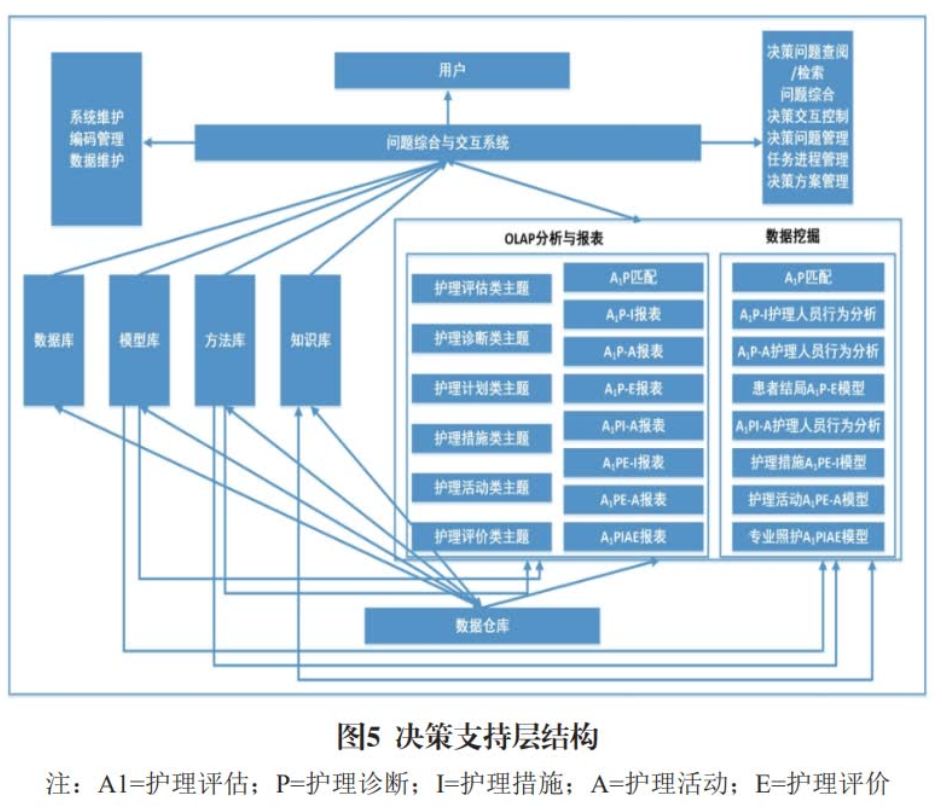 數(shù)據(jù)倉(cāng)庫(kù)、聯(lián)機(jī)分析處理、數(shù)據(jù)挖掘及模型庫(kù)組成智能化護(hù)理綜合評(píng)價(jià)高級(jí)決策支持系統(tǒng)數(shù)據(jù)平臺(tái)。決策支持層分為3層子結(jié)構(gòu),主要由用戶層、問題綜合與交互系統(tǒng)層、聯(lián)機(jī)分析處理與數(shù)據(jù)挖掘?qū)訕?gòu)成。問題綜合與交互系統(tǒng)實(shí)現(xiàn)系統(tǒng)維護(hù)、決策問題與方案查詢/檢索及決策后臺(tái)控制管理,包括系統(tǒng)維護(hù)、決策前臺(tái)、決策后臺(tái)3個(gè)模塊。聯(lián)機(jī)分析處理對(duì)數(shù)據(jù)集中提取的綜合數(shù)據(jù)信息實(shí)現(xiàn)多維數(shù)據(jù)分析處理。數(shù)據(jù)挖掘通過數(shù)據(jù)集進(jìn)行數(shù)據(jù)知識(shí)挖掘,并將結(jié)果傳遞到知識(shí)庫(kù)。通過問題綜合與交互系統(tǒng),調(diào)用模型庫(kù)、知識(shí)庫(kù)、方法庫(kù)處理數(shù)據(jù)庫(kù)及數(shù)據(jù)倉(cāng)庫(kù)中的數(shù)據(jù),將多維分析及數(shù)據(jù)挖掘結(jié)果以多種方式呈現(xiàn)給用戶,見圖5。