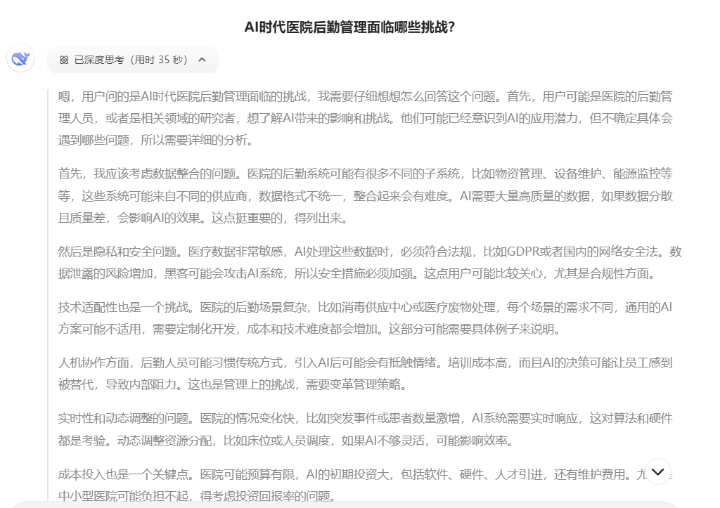 使用新的AI應(yīng)用如DeepSeek等,可以快速地收集和借鑒世界先進(jìn)的案例和成果,對所管轄醫(yī)院的成本進(jìn)行對標(biāo)分析。如每萬平米清潔費、每萬平米保安費、每萬平米維修費,每萬平米能源費等,可以更有效地控制成本。