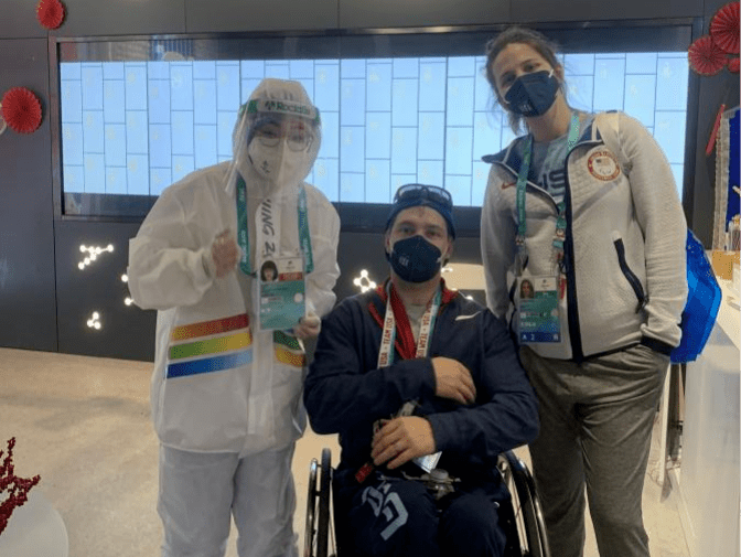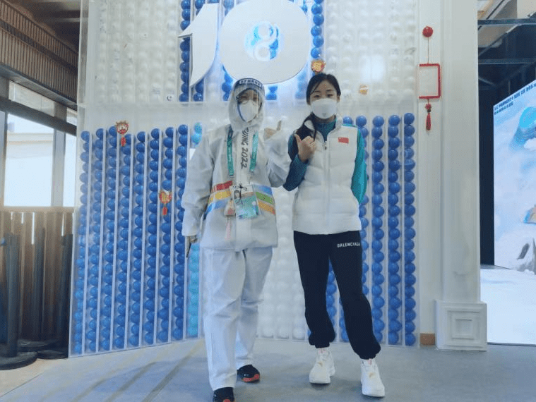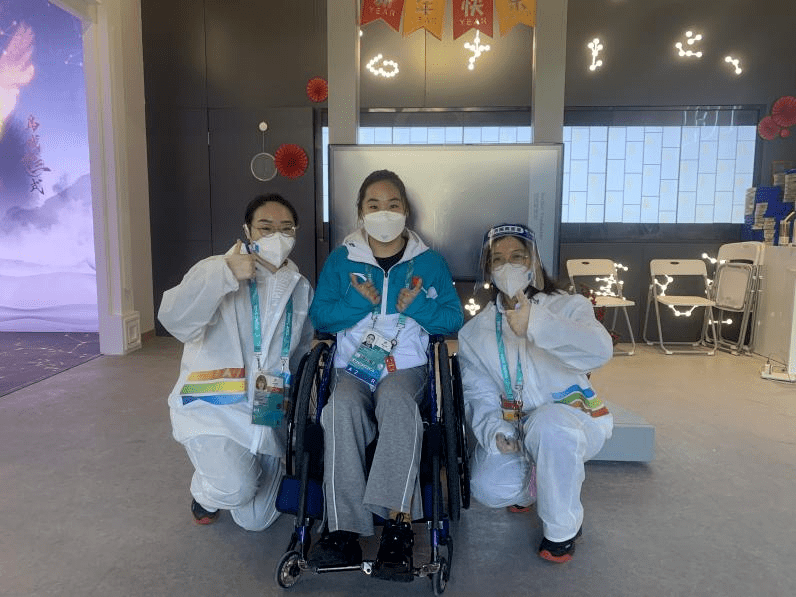 志愿者與殘奧高山滑雪銀牌獲得者張雯靜合影