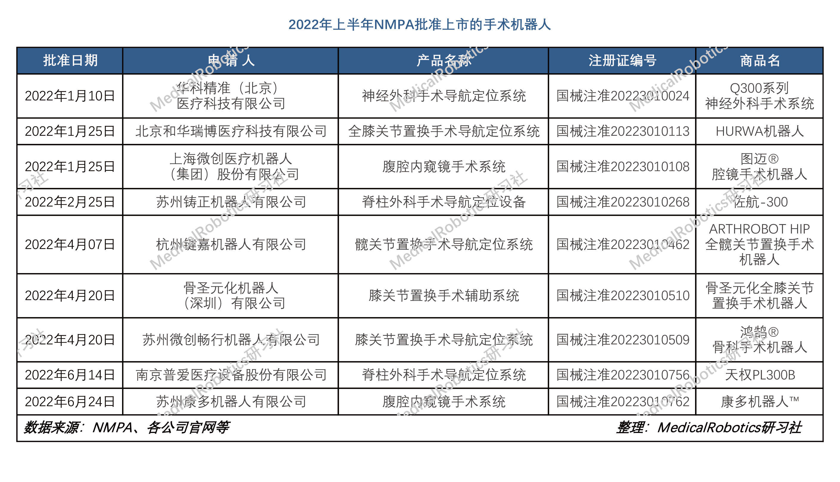 2022年上半年NMPA批準(zhǔn)上市的手術(shù)機(jī)器人多達(dá)9款,呈現(xiàn)井噴之勢(shì),超過了2021全年獲批的6款。期待2022年下半年能延續(xù)上半年的勢(shì)頭,有更多國(guó)產(chǎn)手術(shù)機(jī)器人產(chǎn)品獲批。