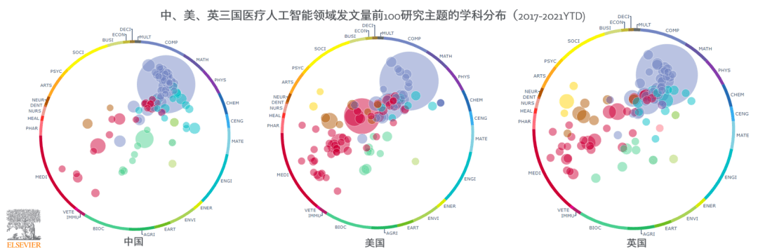 同時(shí),各國(guó)在醫(yī)療人工智能相關(guān)研究所聚焦的研究主題也呈現(xiàn)出不同特征。中國(guó)的醫(yī)療人工智能研究仍以計(jì)算機(jī)、數(shù)學(xué)等理工學(xué)科為本位,呈現(xiàn)開始向醫(yī)學(xué)延申的趨勢(shì),在醫(yī)學(xué)方面目前集中在分子動(dòng)力學(xué)模擬、醫(yī)學(xué)成像等研究方向,在醫(yī)療交叉領(lǐng)域的研究仍有大幅提升空間。美國(guó)的醫(yī)療人工智能研究不僅在計(jì)算機(jī)等學(xué)科相關(guān)的研究主題建樹頗豐,其聚焦的研究主題也更多地分布于醫(yī)學(xué)、藥學(xué)等學(xué)科,且呈現(xiàn)較強(qiáng)的學(xué)科交叉性。英國(guó)醫(yī)療人工智能研究除了與計(jì)算機(jī)、醫(yī)學(xué)交叉融合外,在護(hù)理、神經(jīng)科學(xué)、健康職業(yè)學(xué)科等涉及的研究主題也積極探索。