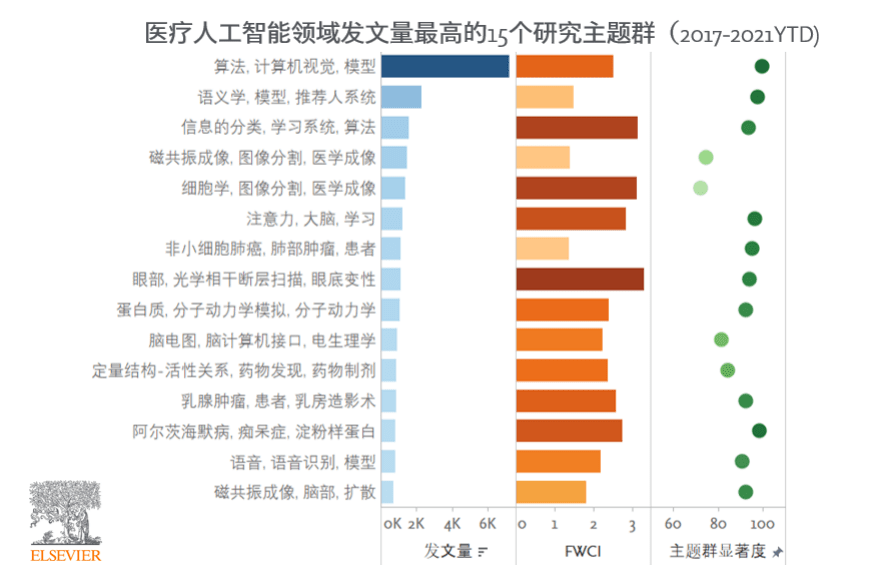 就具體學(xué)科而言,AI在醫(yī)學(xué)、生物化學(xué)遺傳和分子生物學(xué)、神經(jīng)科學(xué)和藥理學(xué)等學(xué)科的占比有顯著增長(zhǎng)。在2017-2021年,全球醫(yī)療人工智能領(lǐng)域發(fā)文量最高的15個(gè)研究主題群包括了:醫(yī)學(xué)成像、分子篩選和藥物發(fā)現(xiàn)、腫瘤診療等方面,展現(xiàn)出AI在根據(jù)生物醫(yī)學(xué)數(shù)據(jù)解讀病因和識(shí)別疾病模式、促進(jìn)藥物研發(fā)、支持診療決策工具來(lái)改善健康管理等應(yīng)用領(lǐng)域的巨大潛力和價(jià)值。