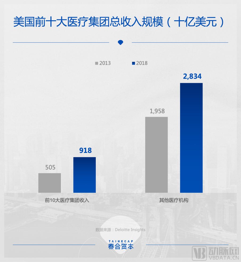 并購熱潮中,強(qiáng)者愈強(qiáng)。在此期間,美國前十大醫(yī)療集團(tuán)市場(chǎng)占有率和收入規(guī)模大幅增長。2013年至2018年間,美國前十大醫(yī)療集團(tuán)的市場(chǎng)占有率提高至24%,合計(jì)收入增長率是其他醫(yī)療機(jī)構(gòu)總收入增長率的近兩倍。