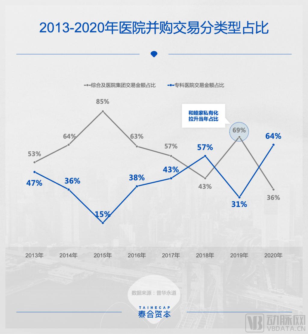從2018年開始,具備??铺厣珒?yōu)勢(shì)及優(yōu)質(zhì)醫(yī)師資源的專科醫(yī)院逐步受到投資方的青睞,并購資金開始由綜合醫(yī)院集團(tuán)向?qū)?七B鎖醫(yī)院傾斜,民營醫(yī)院的并購整合開始成為主流。根據(jù)普華永道統(tǒng)計(jì)數(shù)據(jù)顯示,2020年國內(nèi)??漆t(yī)院并購交易金額占醫(yī)院總并購資金的六成以上。