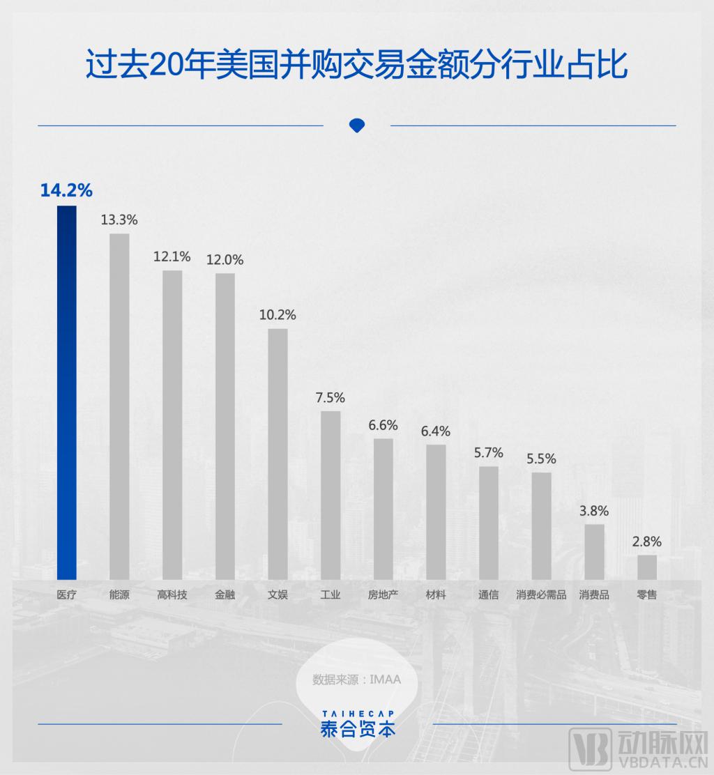 其中,2000年以來的發(fā)展歷程對(duì)中國市場(chǎng)而言更具參考價(jià)值。我們將這二十余年的時(shí)間軸放大,可以發(fā)現(xiàn)醫(yī)療健康行業(yè)是美國并購交易最活躍的領(lǐng)域。在過去20年中,美國總計(jì)發(fā)生超過24萬起并購交易,交易額累計(jì)約為28萬億美金。其中醫(yī)療健康行業(yè)的并購交易規(guī)模最大,超過傳統(tǒng)的能源、TMT科技以及金融行業(yè),交易額近4萬億美金,占比超過14%,在所有行業(yè)中位列第一。作為醫(yī)療體系的核心提供方,醫(yī)院也是美國醫(yī)療行業(yè)整合的最熱點(diǎn)領(lǐng)域,若以人民幣計(jì),其每年并購標(biāo)的總收入累計(jì)超千億元規(guī)模。