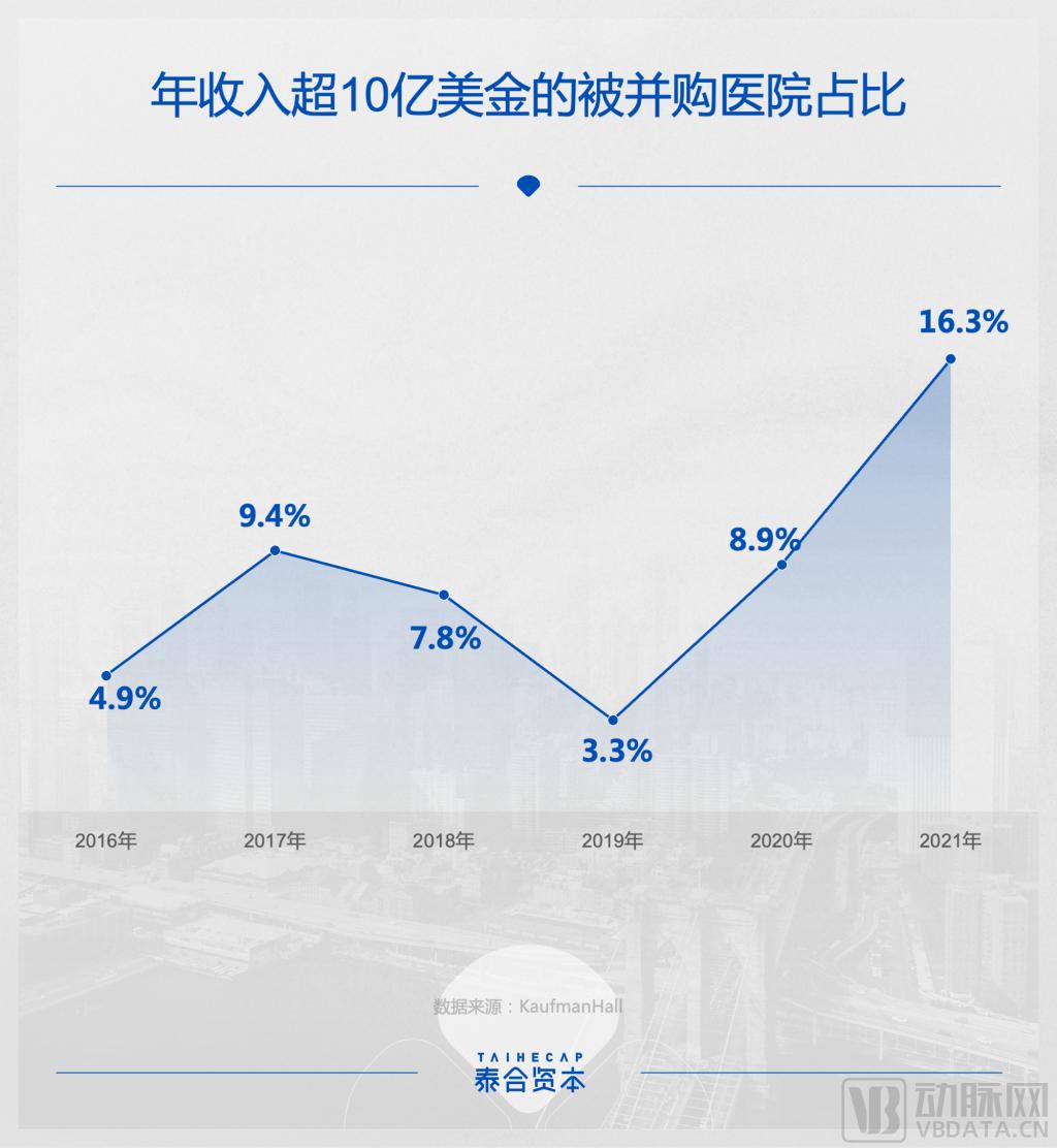2021年,美國醫(yī)院并購交易平均并購標(biāo)的收入規(guī)模近6.19億美元,十年前,該數(shù)值僅為約2.87億美元,單起并購標(biāo)的平均規(guī)模提升超2倍。同時(shí)并購標(biāo)的收入規(guī)模超10億美元的超大型并購項(xiàng)目占比也由2016年的4.9%提升至2021年的16.3%,體現(xiàn)了市場(chǎng)集中度的不斷提升,以及行業(yè)整合趨勢(shì)愈發(fā)明顯。