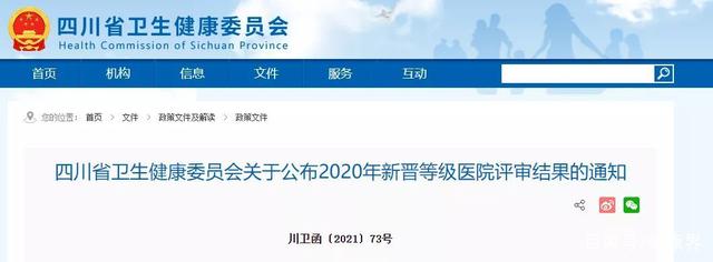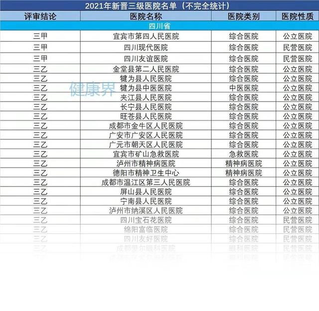 2021年4月2日,四川省衛(wèi)生健康委公布的新晉等級(jí)醫(yī)院評(píng)審結(jié)果中,成都市22家醫(yī)院新晉等級(jí)。其中,新晉三甲醫(yī)院12家,三乙醫(yī)院6家,二甲醫(yī)院4家,晉級(jí)醫(yī)院數(shù)量創(chuàng)歷史之最。