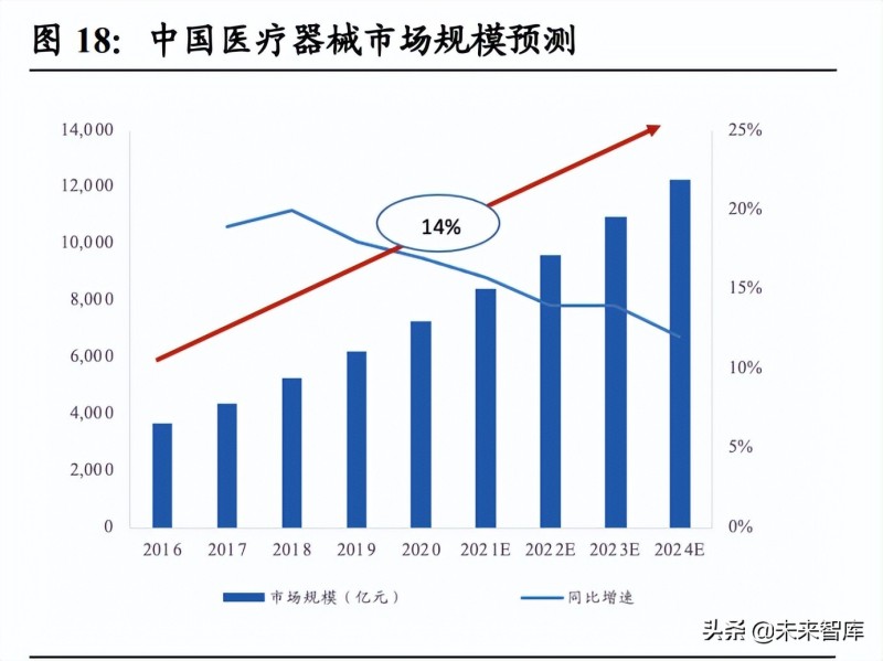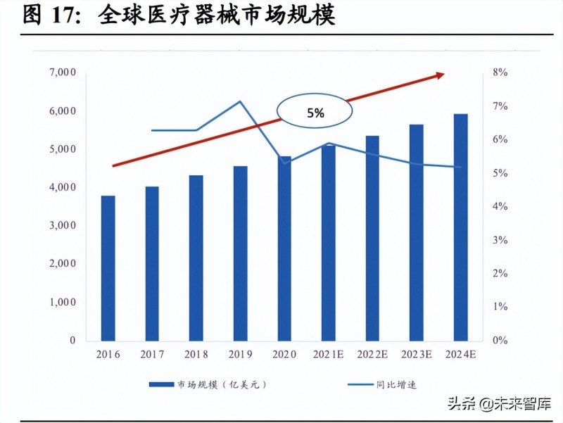 中國(guó)醫(yī)療器械市場(chǎng)空間大,復(fù)合增長(zhǎng)率遠(yuǎn)超全球水平。隨著經(jīng)濟(jì)的持續(xù)發(fā)展和相關(guān) 制度的完善,居民的生活水平不斷提高,醫(yī)療保健意識(shí)也逐漸增強(qiáng),由此帶來(lái)醫(yī)療 器械產(chǎn)品需求的持續(xù)增長(zhǎng),醫(yī)療器械行業(yè)市場(chǎng)規(guī)模進(jìn)一步擴(kuò)大,再加上國(guó)家出臺(tái)的 支持性政策的影響,行業(yè)整體步入高速成長(zhǎng)期,景氣度日益提升,在整個(gè)醫(yī)療行業(yè) 中的重要地位也越發(fā)凸顯。據(jù) Evaluate MedTech 發(fā)布的統(tǒng)計(jì)數(shù)據(jù),預(yù)計(jì) 2024 年全 球醫(yī)療器械銷售額將達(dá)到 5945 億美元,2020 年到 2024 年間復(fù)合增長(zhǎng)率為 5%。2016 年到 2020 年,中國(guó)醫(yī)療器械市場(chǎng)規(guī)模從 3700 億元增長(zhǎng)至 7295 億元,期間年復(fù)合 增長(zhǎng)率為 14%,增速遠(yuǎn)超全球市場(chǎng)同期水平。