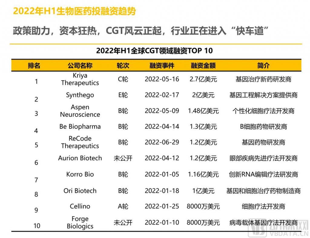 2022 年 1 月,《十四五醫(yī)藥工業(yè)發(fā)展規(guī)劃》提出重點(diǎn)開發(fā)細(xì)胞治療和基因治療藥物等新型生物藥的產(chǎn)業(yè)化制備技術(shù)。同時,上半年細(xì)胞與基因治療領(lǐng)域吸引了紅杉、高瓴、經(jīng)緯、啟明、OrbiMed、RA Capital 等頂級投資機(jī)構(gòu)入局。由此可見,細(xì)胞與基因治療在政策、技術(shù)、資本、下游市場等支撐下,行業(yè)正在進(jìn)入 " 快車道 "。