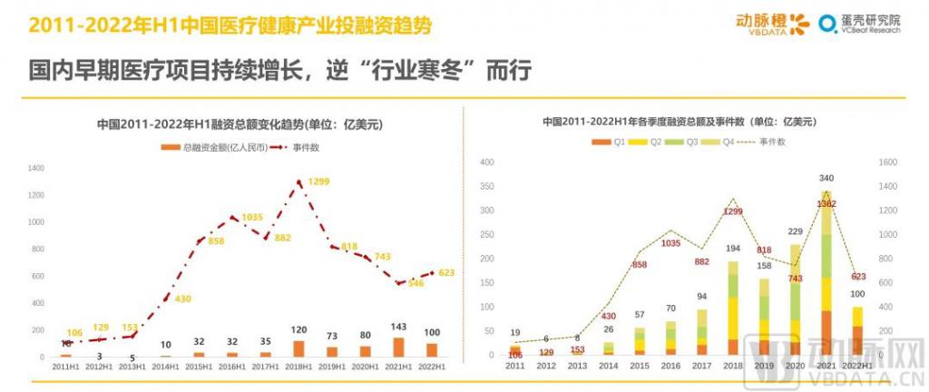 2022 年 H1,中國醫(yī)療健康產(chǎn)業(yè)投融資總額近 100 億美元(約 647.59 億人民幣),同比下降超 40%;與此同時國內(nèi)融資交易數(shù)量為到 623 起,較 2021 年 H1 增加 77 起。