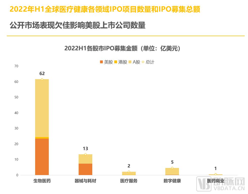 據(jù)動脈橙數(shù)據(jù)庫顯示,2022 年 H1,在 A 股、美股以及港股上市的醫(yī)療健康領(lǐng)域企業(yè)共 59 家,募集總額超 86.68 億美元,同比 2021 年無論數(shù)量還是金額均有大幅度下滑;且與以往美股企業(yè)占去 " 半壁江山 " 的情況不同,2022 年 A 股和美股上市企業(yè)數(shù)量差距縮小。