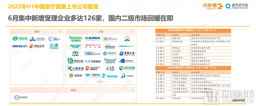不過,國內(nèi)二級市場的低迷局面有望在下半年打破。在 6 月 27 日到 6 月 29 日的短短三天里,已經(jīng)有 5 家醫(yī)療健康企業(yè)向港交所遞交招股說明書;科創(chuàng)板、創(chuàng)業(yè)板新增受理企業(yè)達(dá)到了創(chuàng)記錄的 126 家,且有 5 家企業(yè)成功過會。