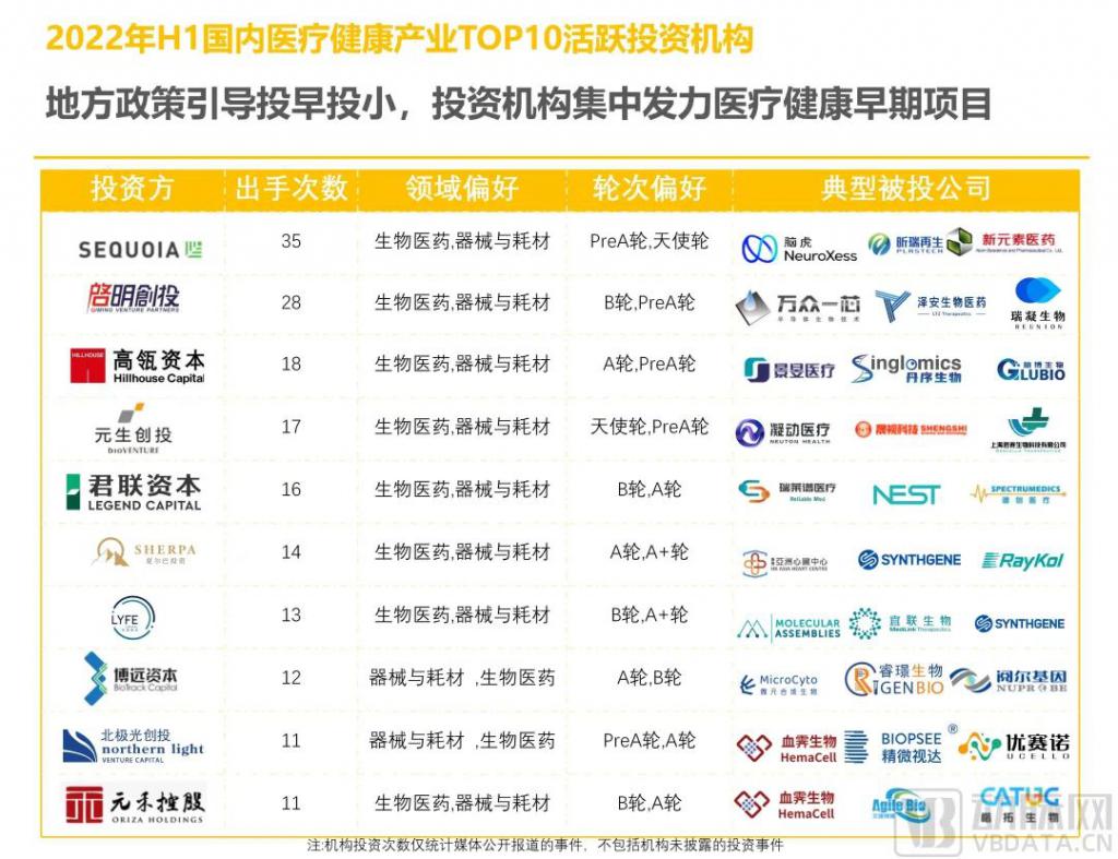 2022 年 H1,國內(nèi)醫(yī)療健康最為活躍的機(jī)構(gòu)是紅杉資本中國基金,全年破紀(jì)錄的累計出手 35 次,其投資標(biāo)的以生物醫(yī)藥公司為主。