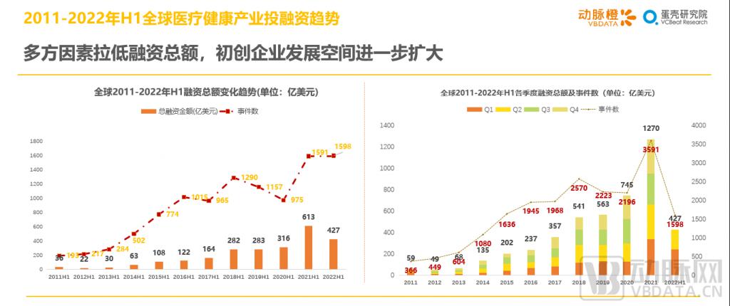 2022 年 H1,全球醫(yī)療健康產(chǎn)業(yè)共發(fā)生 1598 起融資事件,同比增加 6 起;融資總額達(dá) 427 億美元(約 2777.34 億人民幣),居歷史第二位,同比 2021 年 H1 的歷史巔峰下降約 43%,整體趨于冷靜;與此同時,資本在 2022 年 H1 依舊延續(xù)了 2021 年對初創(chuàng)公司的態(tài)度:包容度繼續(xù)提高,更多有潛力和成長性的初創(chuàng)企業(yè)得到資本助力。