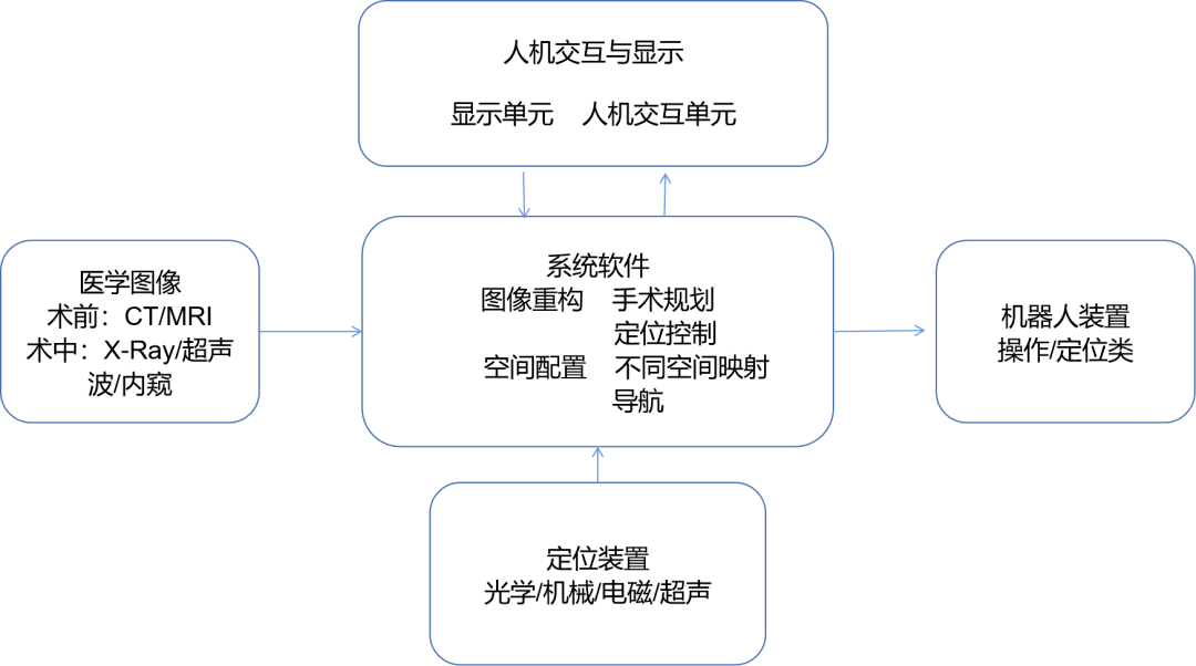 手術(shù)機器人作為一種多學(xué)科交叉的醫(yī)療器械,主要的功能模塊包括人機交互與顯示、醫(yī)學(xué)圖像、系統(tǒng)軟件、機器人裝置、定位裝置,涉及學(xué)科包括力學(xué),計算機科學(xué),機械科學(xué),微電子學(xué),臨床醫(yī)學(xué)等。