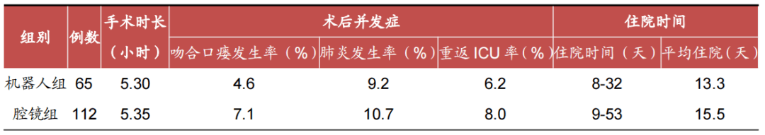 使用手術(shù)機器人術(shù)后的并發(fā)癥發(fā)生概率明顯低于腔鏡組、愈后更好,對應(yīng)的術(shù)后住院時間更短平均減少2.2天。在不考慮手術(shù)費用的影響下,機器人組在手術(shù)效果上面有著明顯優(yōu)勢。