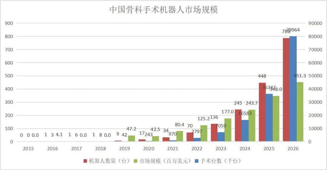 根據(jù)Frost&Sullivan數(shù)據(jù),全球骨科手術(shù)機器人市場規(guī)模從2016年的2.6億美元增加至2020年的13.9億美元。自2020年起我國骨科手術(shù)機器人的數(shù)量將從17臺增加至2026年的788臺,市場規(guī)模也將從0.15億美元增長到2026年的3.32億美元,復(fù)合增長率為68%。