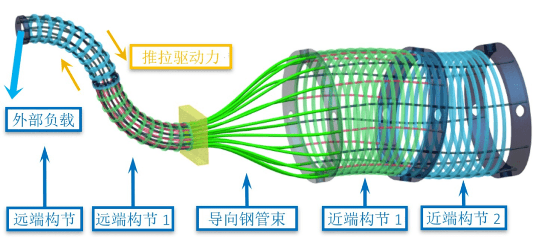 如圖所示,“可形變對(duì)偶連續(xù)體機(jī)構(gòu)”由近端構(gòu)節(jié)、導(dǎo)向鋼管束以及遠(yuǎn)端構(gòu)節(jié)組成,超彈性鎳鈦合金細(xì)桿作為結(jié)構(gòu)骨從頭至尾貫穿。近端構(gòu)節(jié)的彎轉(zhuǎn),會(huì)帶來十余根結(jié)構(gòu)骨的推拉運(yùn)動(dòng),這些推拉運(yùn)動(dòng)傳遞到遠(yuǎn)端構(gòu)節(jié),協(xié)同將遠(yuǎn)端構(gòu)節(jié)向相反的方向彎轉(zhuǎn)。