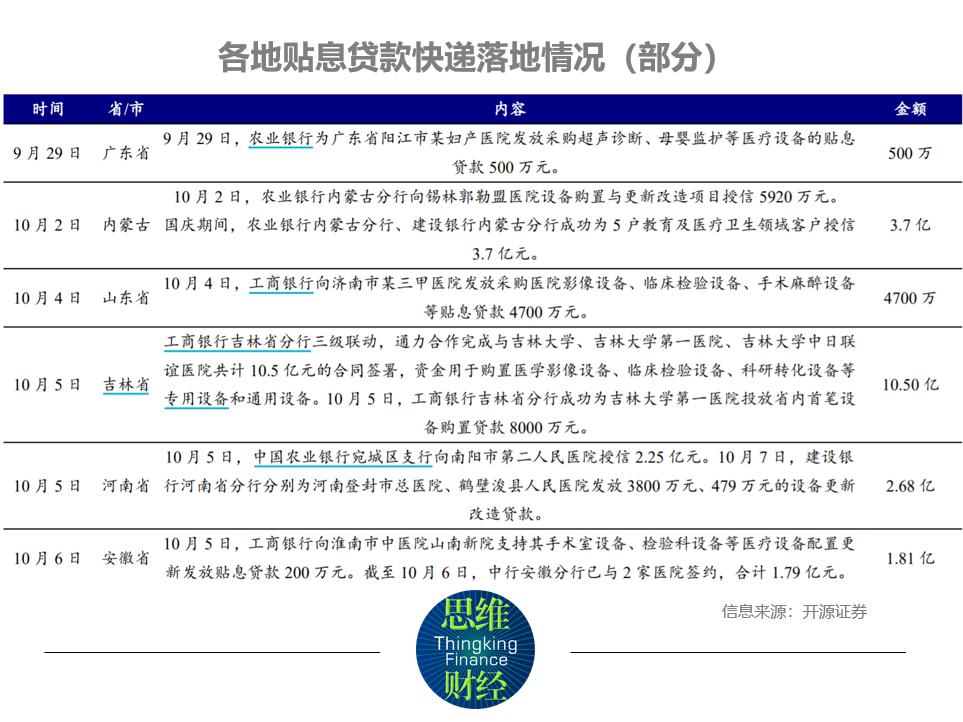 目前各省市積極響應(yīng)政策,已開始執(zhí)行使用財(cái)政貼息貸款更新改造醫(yī)療設(shè)備需求的調(diào)查工作,截至 9 月 30 日,僅浙江、江蘇、安徽等省已上報(bào)約 180 億元的設(shè)備采購需求。全國數(shù)千億級醫(yī)療設(shè)備更新改造需求即將釋放。十一國慶期間財(cái)政貼息貸款項(xiàng)目單位與銀行積極簽約對接保障工作,目前各地貼息貸款快速落地,截至 10 月 11 日公開數(shù)據(jù),各省市已落地貼息金額約 191.55 億元。