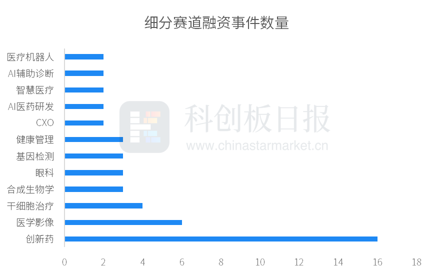 從投資事件數(shù)量來看,5月醫(yī)療器械、生物制藥、生物技術(shù)、醫(yī)療設(shè)備等領(lǐng)域活躍度居前;從融資規(guī)模來看,生物制藥反超醫(yī)療器械位列第一,披露的融資金額約12.52億元。具體到細(xì)分賽道,創(chuàng)新藥熱度遙遙領(lǐng)先,醫(yī)學(xué)影像、干細(xì)胞治療、合成生物學(xué)、眼科、基因檢測、健康管理等受機(jī)構(gòu)關(guān)注度也較高。