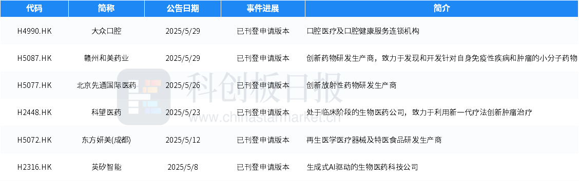 此外,5月港交所已受理與遞交招股書的醫(yī)藥相關(guān)企業(yè)如下。