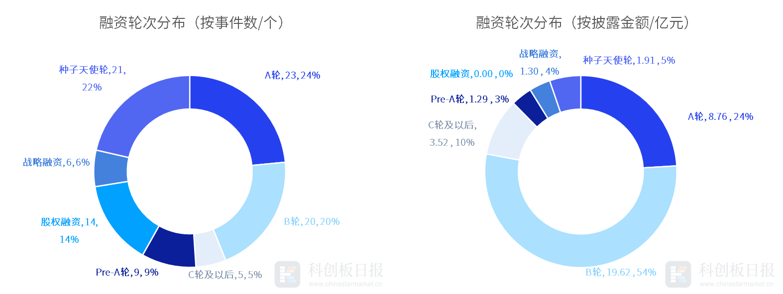 從投資輪次來看,5月醫(yī)療健康領(lǐng)域,除股權(quán)融資外,A輪融資事件數(shù)保持最多,發(fā)生23起,占比24%;其次是種子天使輪,發(fā)生21起,占比22%。從融資規(guī)模來看,B輪披露的融資總額最高,約19.62億元;其次是A輪,約8.76億元。