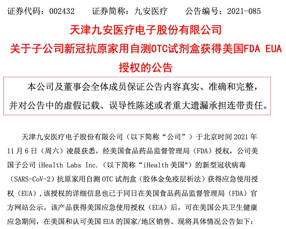 時(shí)間拉回到去年的11月8日,九安醫(yī)療發(fā)布公告稱,其位于美國的子公司iHealth Labs Inc.的產(chǎn)品“新型冠狀病毒抗原家用自測OTC試劑盒”獲得了FDA(美國食品藥品監(jiān)督管理局)的應(yīng)急使用授權(quán),需求者購買無需處方,通過美國的電商、藥店、商超等渠道進(jìn)行銷售。