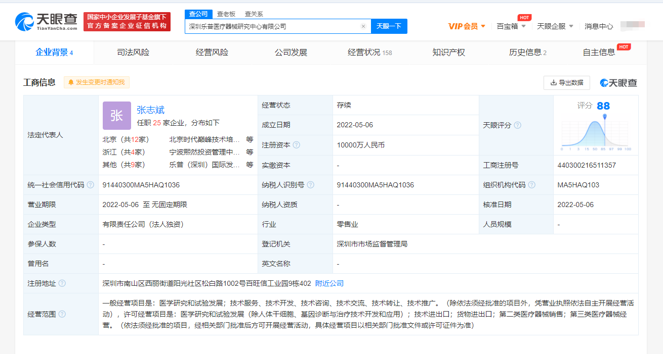 近日,深圳樂普醫(yī)療器械研究中心有限公司成立,法定代表人為張志斌,注冊資本1億人民幣。公司經(jīng)營范圍包括醫(yī)學(xué)研究和試驗(yàn)發(fā)展;技術(shù)服務(wù);技術(shù)開發(fā);醫(yī)學(xué)研究和試驗(yàn)發(fā)展等。股權(quán)穿透圖顯示,該公司由樂普(北京)醫(yī)療器械股份有限公司間接全資控股。