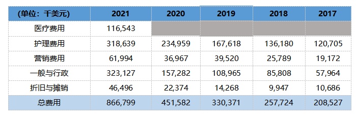 One Medical的費用包括醫(yī)療費用、護理、營銷、一般與行政以及折舊與攤銷。其中,醫(yī)療費用只在2021年度有所體現(xiàn),代表的是Medicare業(yè)務產(chǎn)生的醫(yī)療費用。在剩余項目中,占比最高的為護理費用,這部分包括開設線下診所以及招募護理員工和供應商的費用。