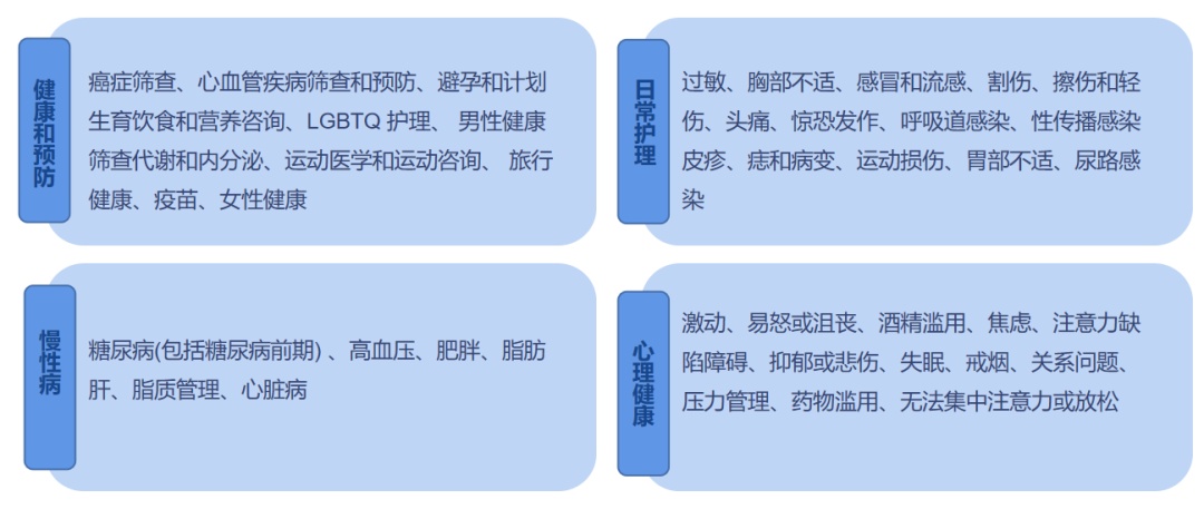 線下護理涵蓋健康和預防、日常護理、慢性病、心理健康,性健康、LGBTQ+服務等,具體如下。