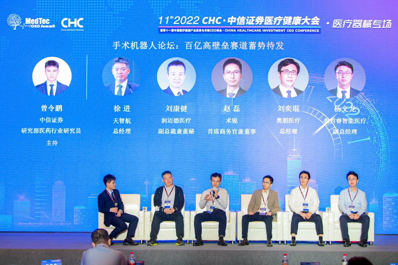 2022年9月1日,由CHC醫(yī)療咨詢與中信證券聯(lián)合主辦的“2022CHC·中信證券醫(yī)療健康大會暨第十一屆中國醫(yī)療健康產(chǎn)業(yè)投資與并購CEO峰會”在安徽合肥盛大召開。大會聚焦前沿?zé)狳c,舉辦手術(shù)機器人專場論壇。作為大會戰(zhàn)略合作企業(yè)及血管介入手術(shù)機器人賽道的領(lǐng)軍企業(yè),潤邁德醫(yī)療副總裁兼董秘劉康健先生受邀參加論壇,并宣告潤邁德醫(yī)療將打造平臺級血管介入手術(shù)機器人,推進(jìn)實現(xiàn)自動化診療無人手術(shù)室。此次論壇深入探討了手術(shù)機器人技術(shù)進(jìn)展、商業(yè)模式、行業(yè)政策等方面的問題,潤邁德醫(yī)療與天智航、術(shù)銳、奧朋、思哲睿等行業(yè)領(lǐng)跑企業(yè),就這一蓄勢待發(fā)的百億高壁壘賽道進(jìn)行了深入的交流和討論。