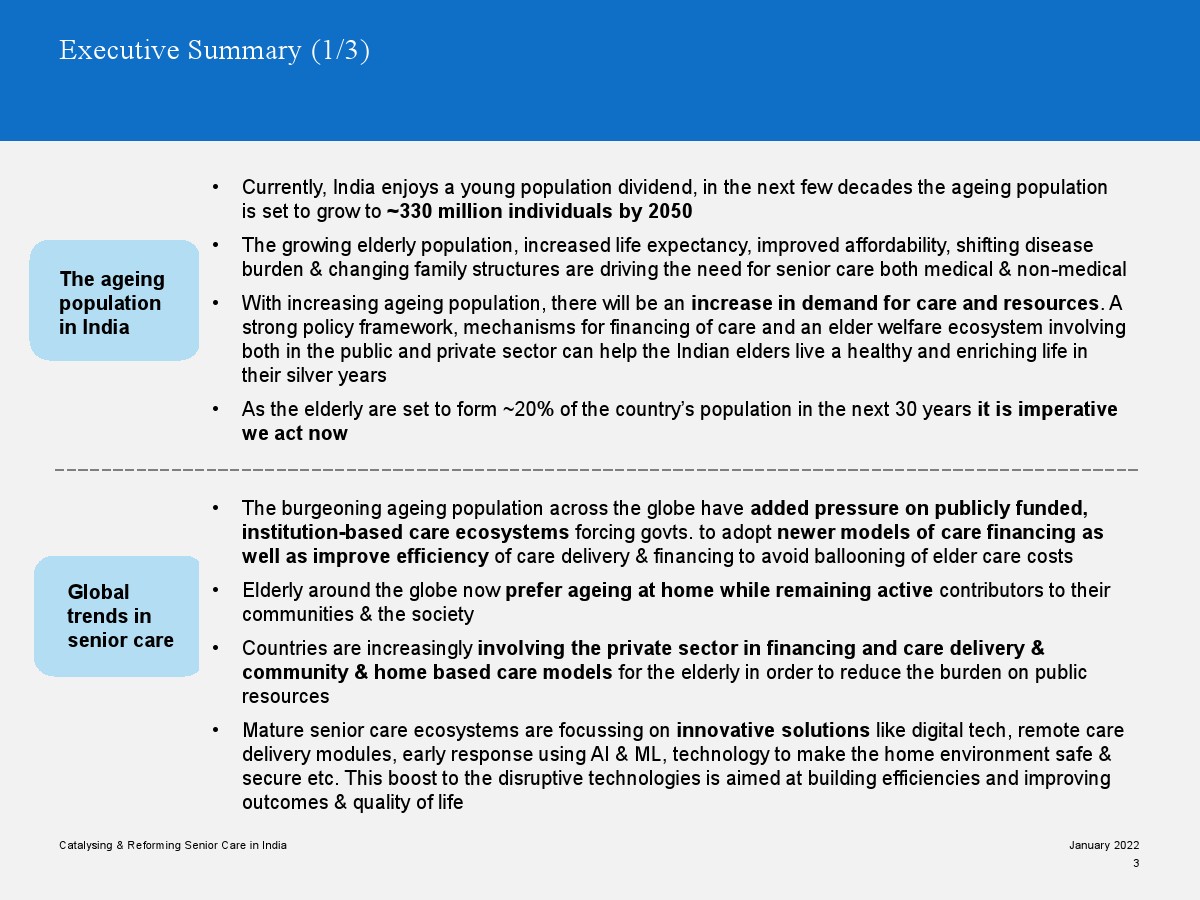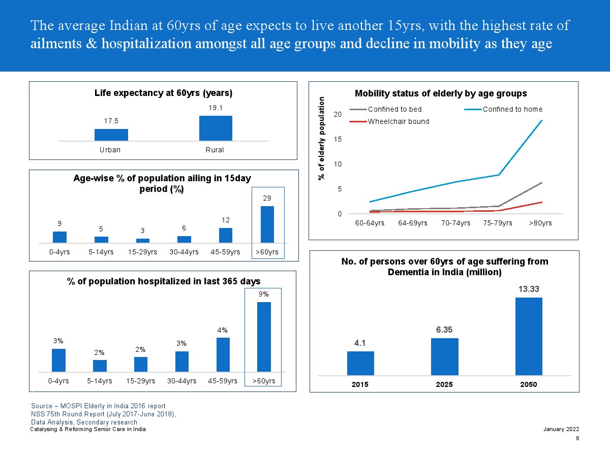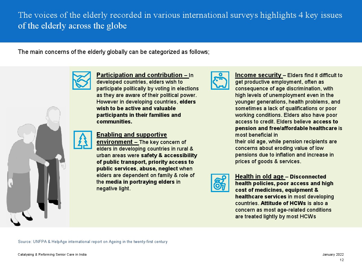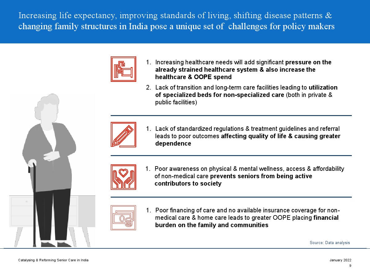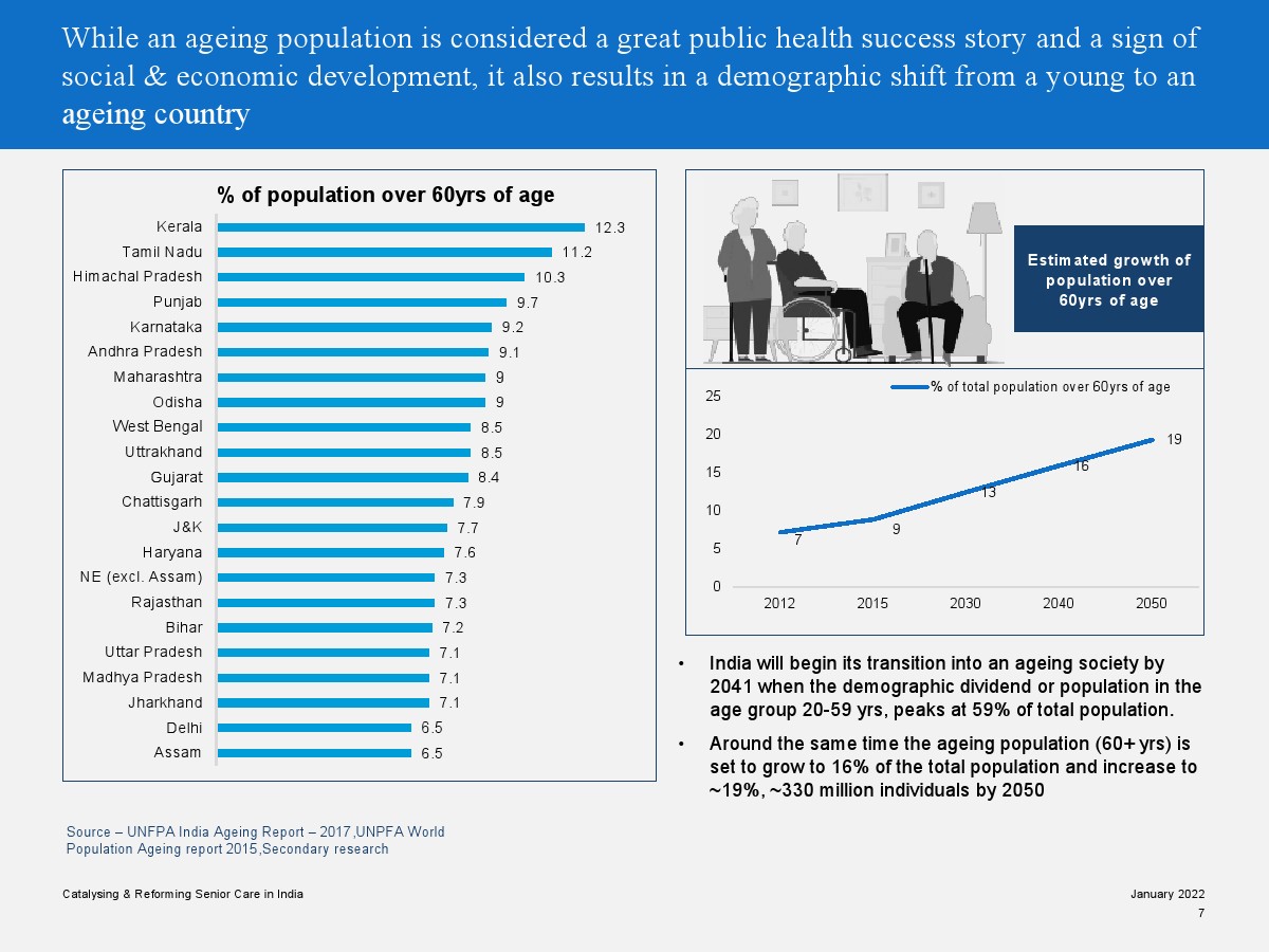 印度老年人協(xié)會發(fā)布了新報(bào)告“促進(jìn)和改革印度老年人護(hù)理”。目前,印度享有年輕人口紅利。但到2050年,老齡化人口將增長到約3.3億人。老年人口的增長、預(yù)期壽命的延長、負(fù)擔(dān)能力的提高、疾病負(fù)擔(dān)的轉(zhuǎn)移和家庭結(jié)構(gòu)的變化正在推動(dòng)對醫(yī)療和非醫(yī)療老年護(hù)理的需求。隨著人口老齡化的加劇,對護(hù)理和資源的需求將會增加。由于老年人將在未來30年內(nèi)占該國人口的20%,因此印度必須立即采取行動(dòng)。
