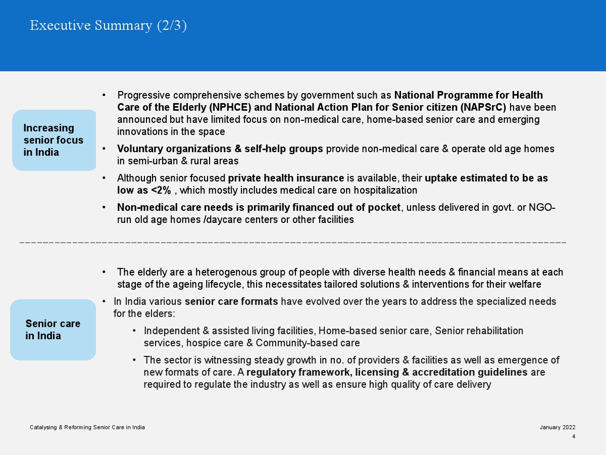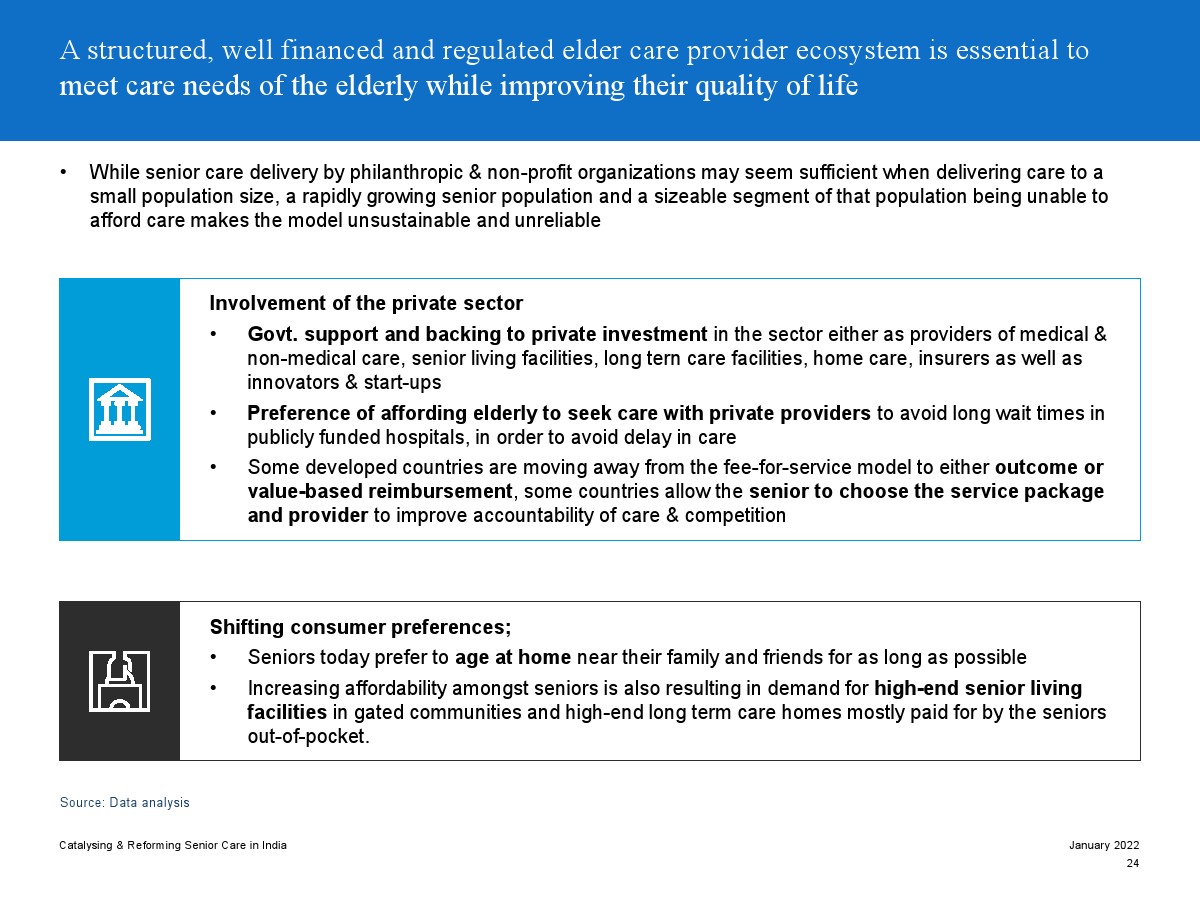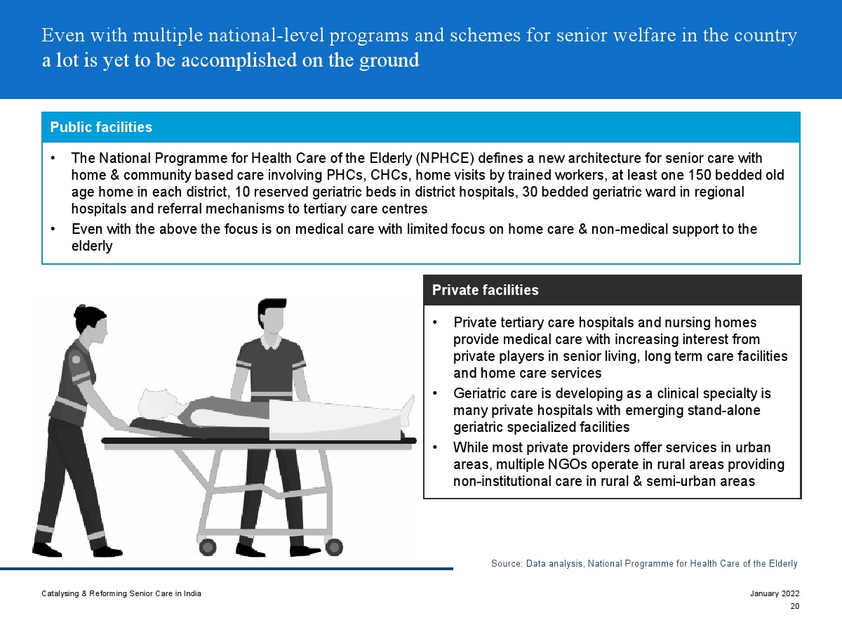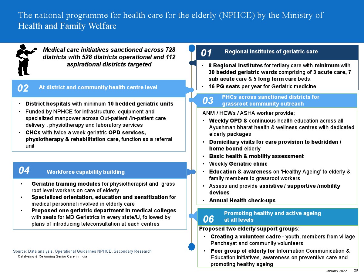 印度老年人協(xié)會發(fā)布了新報(bào)告“促進(jìn)和改革印度老年人護(hù)理”。目前,印度享有年輕人口紅利。但到2050年,老齡化人口將增長到約3.3億人。老年人口的增長、預(yù)期壽命的延長、負(fù)擔(dān)能力的提高、疾病負(fù)擔(dān)的轉(zhuǎn)移和家庭結(jié)構(gòu)的變化正在推動(dòng)對醫(yī)療和非醫(yī)療老年護(hù)理的需求。隨著人口老齡化的加劇,對護(hù)理和資源的需求將會增加。由于老年人將在未來30年內(nèi)占該國人口的20%,因此印度必須立即采取行動(dòng)。
